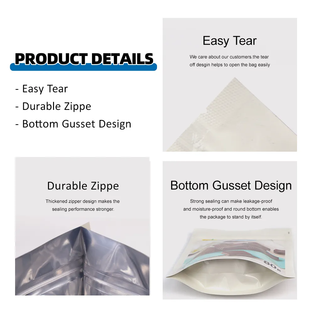 - Stand-Up Zipper Design for Better Shelf Impact: The reinforced bottom gusset allows the pouch to stand firmly on shelves, improving product visibility. The resealable zipper ensures easy opening and closing, offering consumers convenient reuse and freshness retention.